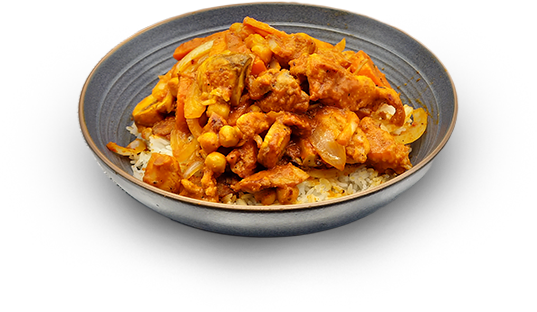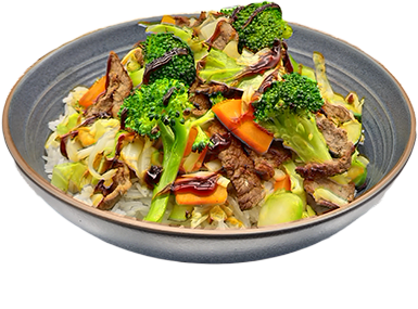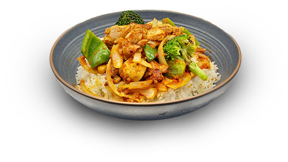 Teriyaki chicken, mixed peppers, carrots, cabbage, broccoli, and butter chicken sauce, served on a bed of white rice or quinoa.