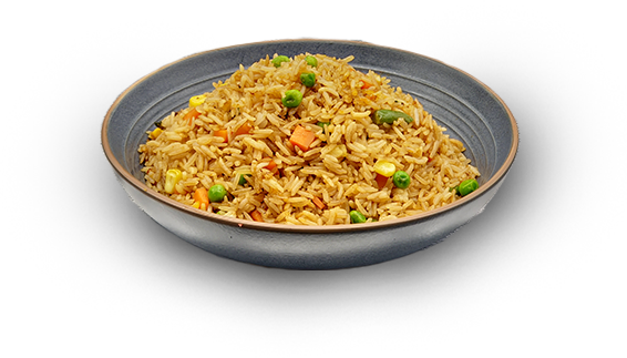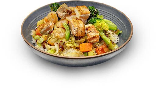 White rice or Quinoa cooked with sizzling Shrimp, Chicken and Veggies.