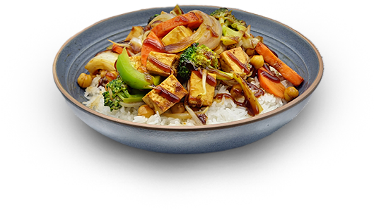 Stir-fried mixed vegetables, egg fried rice serve with choice of your protein and sauces.